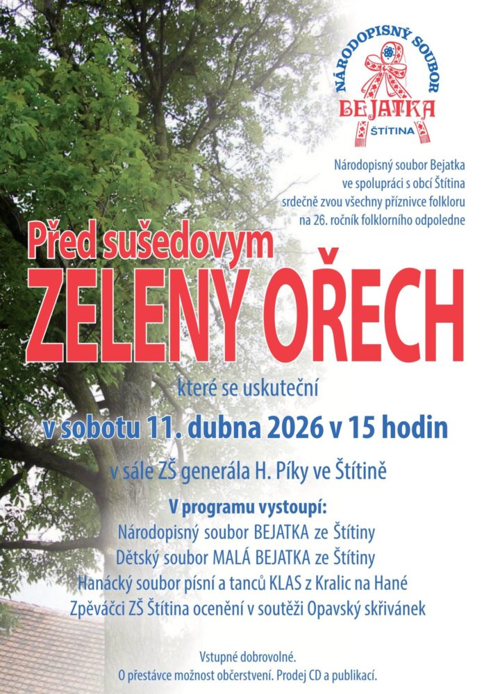 tradiční folklorní sobotní odpoledne v domácím prostředí sálu štítinské školy se letos uskuteční 11. dubna 2026 v 15 hodin.